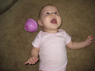 What you can't see are the many smatterings of rice cereal that cover the floor! I know you're all thinking, "aren't you supposed to swipe the spoon over her face and feed it to her?" Here's the thing, she's so active that it's all I can do to keep her from squirming out of the bumbo. There was cereal in her hair, eye, ear, and toes.